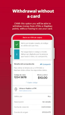 [+] Withdraw money from the ATM or Rapibac points only with a code created from the App.