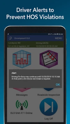 HOS COMPLIANCE ALERTS - App continuously checks drivers’ hours against the current DOT hours-of-service rules and company rulesets, and alerts drivers of impending violations.