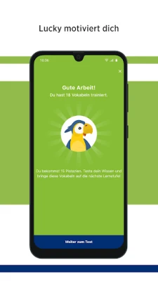 Ganz übersichtlich teilt sich das Training in die Phasen Einprägen, Üben und Abfragen auf. Verschiedene Übungen machen das Lernen abwechslungsreich und du bekommst immer wieder Feedback und Tipps von Lucky, dem sprachbegabten Papagei. Außerdem gibt es eine übersichtliche Lernstatistik, mit der du deine Leistungen im Blick behältst.