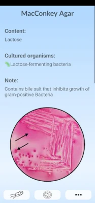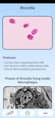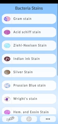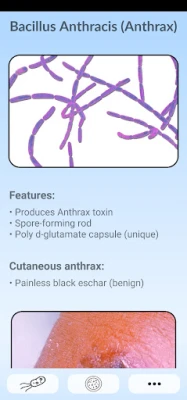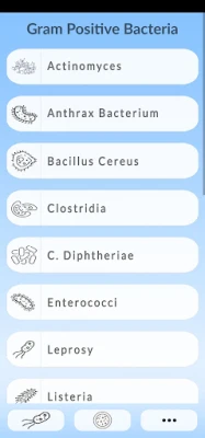 By exploring the neatly organized sections, you can chose any bacteria and see it under the microscope, see the diseases it causes, see the symptoms, and learn the high-yield facts.
