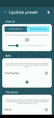 - Supports ringing the bell at fixed intervals (5 mins, 10 mins, 15 mins, 20 mins, 25 mins, 30 mins, 1 hour, 2 hours, etc.).