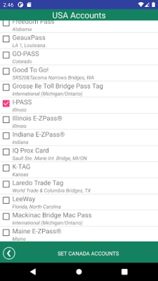 If you are traveling with a transponder you can select it from the comprehensive list of transponder accounts in the Options menu and Tollsmart will apply the appropriate discounts, as well as highlight which toll facilities along your route accept your transponder (green push pin) and which will not (purple push pin). Cashless toll booths are highlighted in red push pins. Please note for E-ZPass accounts it’s important to select the state in which your transponder account was acquired (i.e. NY E-ZPass) as discounts may not apply across other states, even those that are also part of the E-ZPass network.